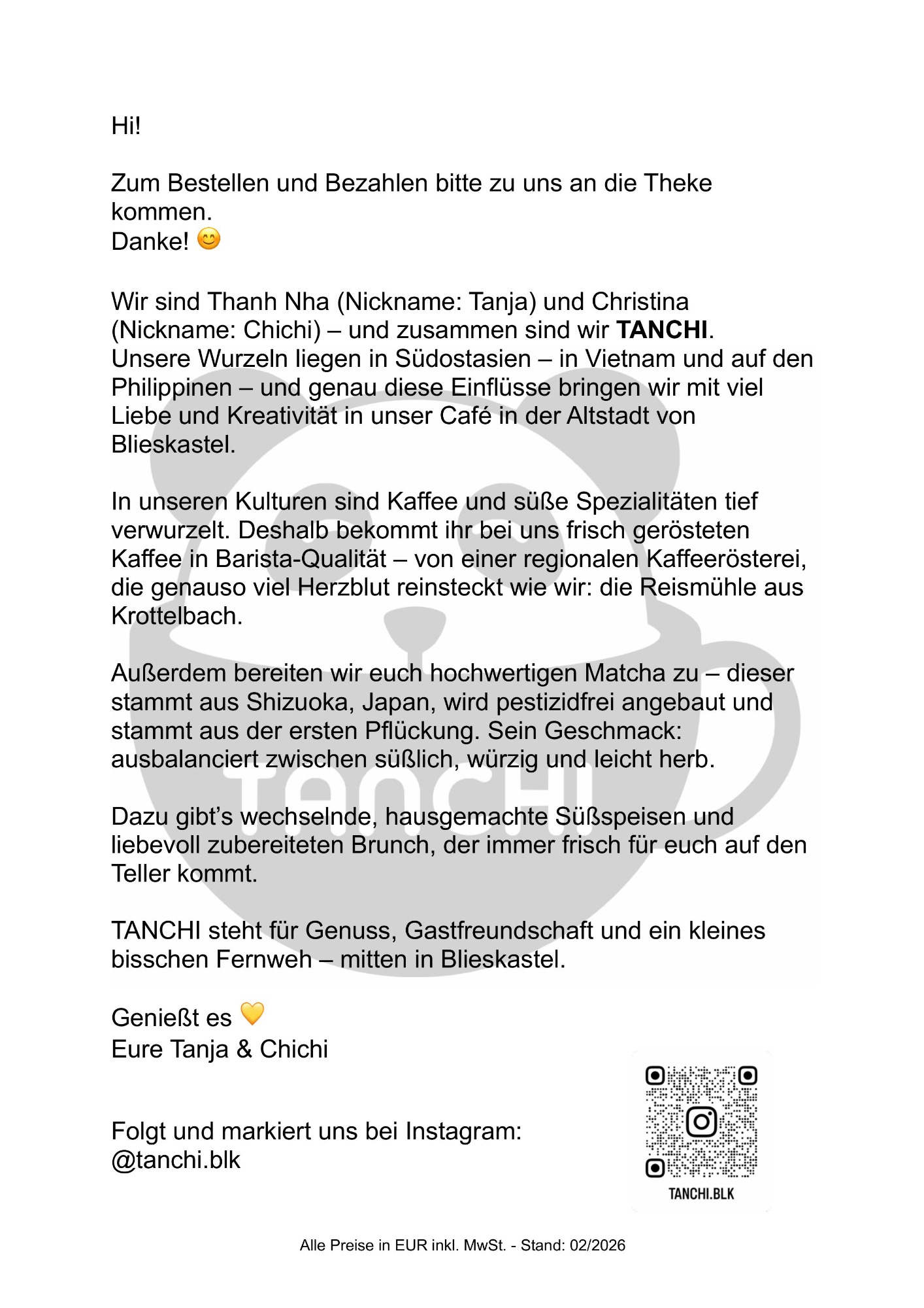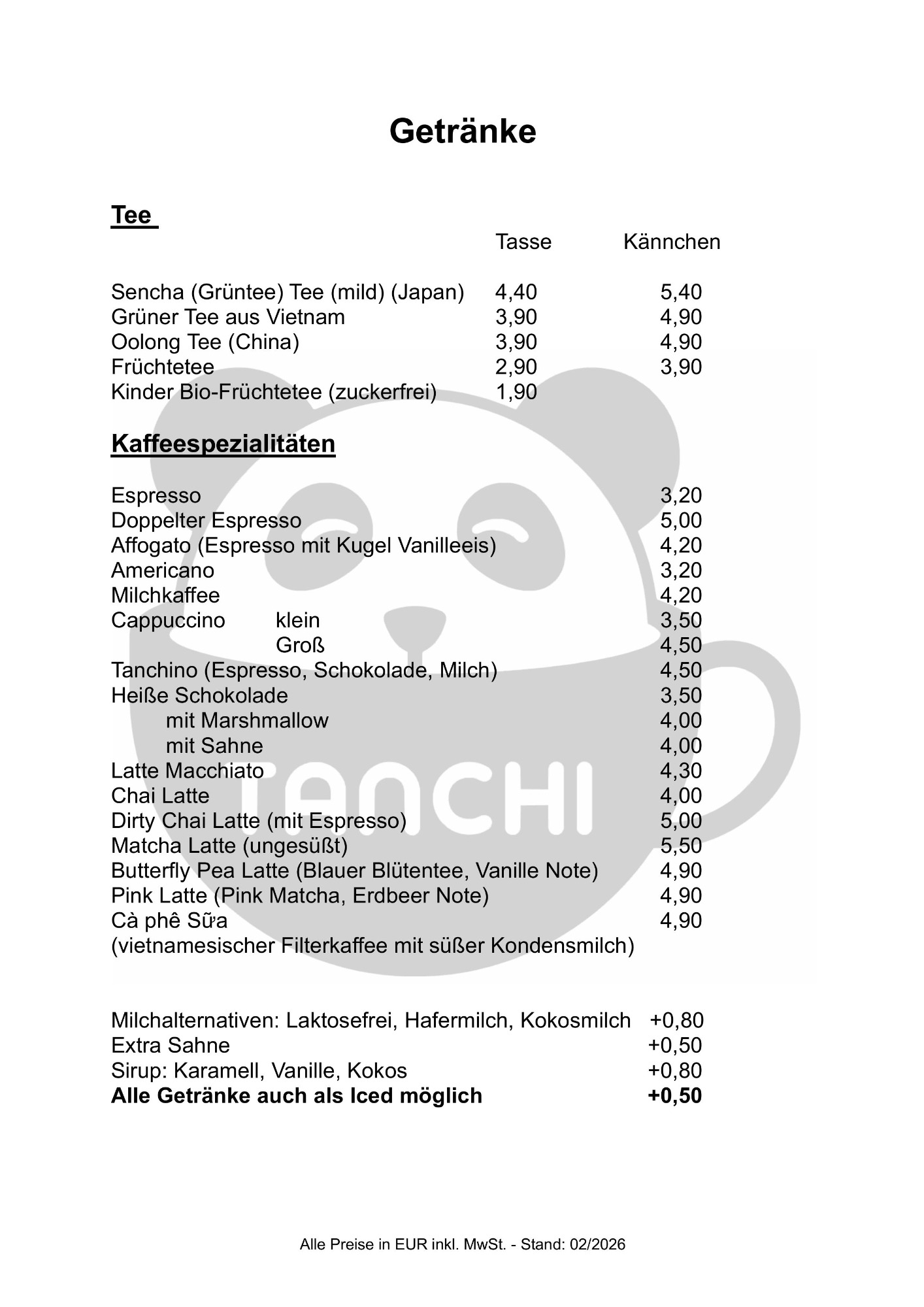 Lust auf etwas Neues? Bei uns erwarten euch süße und herzhafte Spezialitäten aus Südostasien - frisch zubereitet und mit Liebe gemacht. Dazu ein Barista-Kaffee oder ein eiskalter Strawberry Matcha Latte? Werft einen Blick auf unsere Karte und entdeckt unsere Speisen und Getränke. Neben unserem festen Angebot überraschen wir euch regelmäßig mit neuen Aktionsgerichten - sprecht uns gerne darauf an! Kommt vorbei und probiert's aus!